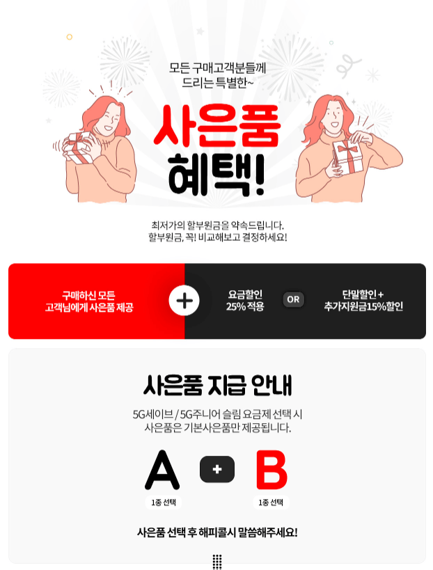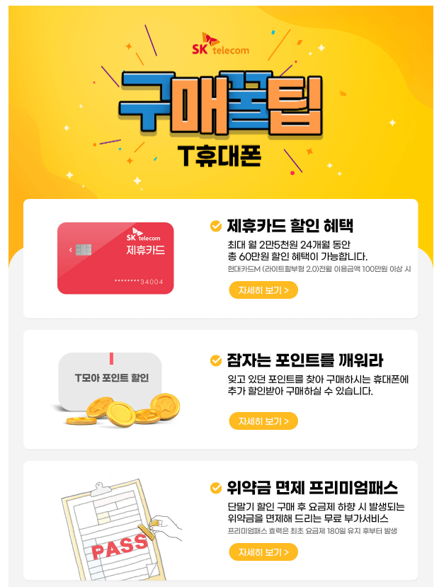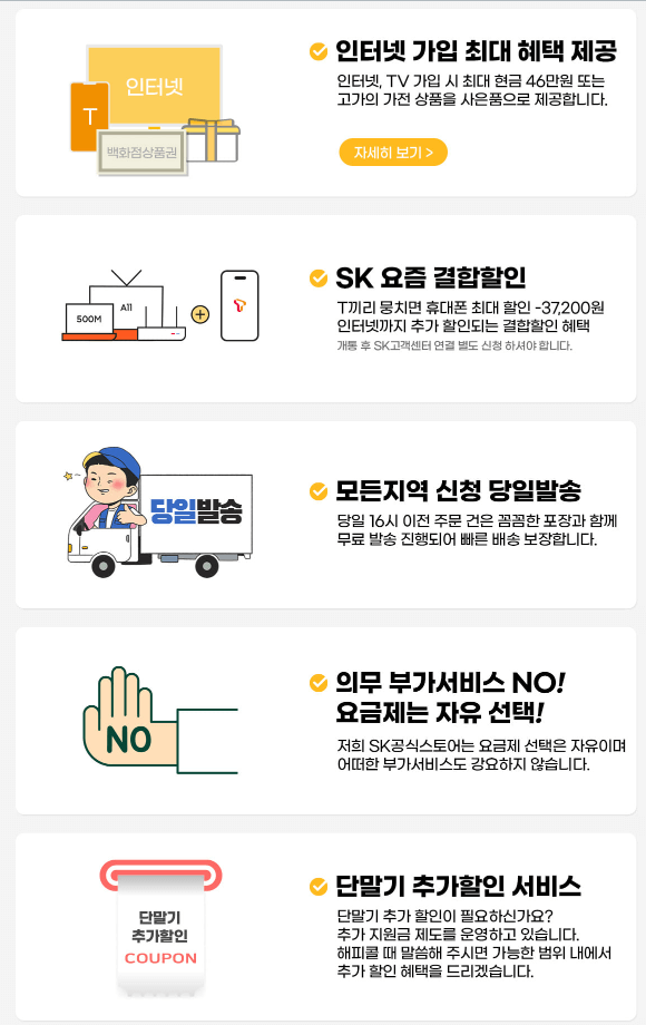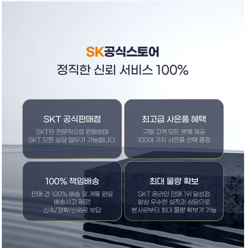 - SK 스토어 공식몰(http://www.skpremiummall.com/)에 접속하시어 쉽고 간편한 구매 진행 절차를 진행하시면 됩니다. 진행절차는 구매 모델과 가입신청서 작성→본사 해피콜 수신→상품 및 사은품 배송 그리고 개통 처리 진행 순으로 진행됩니다. 요금제 상관없이 100% 기본 사은품과 스페셜 사은품(44가지 중 1가지 선택) 이벤트도 진행하고 있으니 참고하세요. 또한 고객센터 1599-4621로 전화 문의하시면 신속한 답변을 받을 수 있습니다.