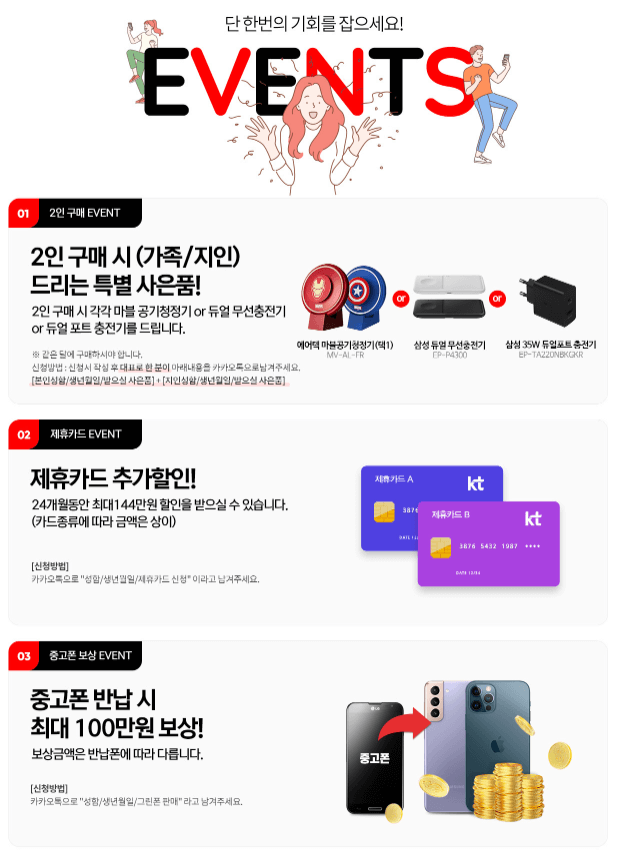 - KT 스토어 공식몰(https://www.ktstore.co.kr/)에 접속하시어 간편한 구매 진행 절차에 따라서 진행하시면 됩니다. 진행절차는 기종선택→신청서작성→해피콜수신→상품/사은품발송→상품수령으로 진행됩니다. 이외에도 다른 이벤트 혜택도 있으니 아래에 홈페이지에서 자세한 정보 확인해 보세요. 고객센터 1577-3269로 전화상담 또는 카카오톡으로 문의하세요.