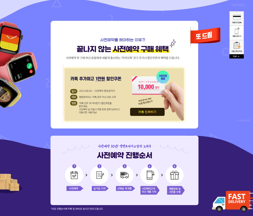 - 엠엔프라이스(https://www.mnprice.com/ )에 접속하시어 사전예약 혜택을 받으시고 구매하세요. 진행절차는 사전예약→실가입 시작→선배송 후개통→사전예약고객 우선 개통 시작→개통완료 및 사은품 수령으로 진행되고 카톡 및 SMS로 실시간 안내해 드립니다.