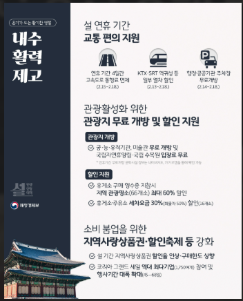 설 연휴 4일간 고속도로 통행료 면제, KTX·SRT 할인, 공공기관 주차장 무료 개방이 시행됩니다. 관광지 무료 개방과 지역 할인 행사도 확대되어 내수 활성화를 유도합니다. 동시에 24시간 응급의료체계, 한파·화재 예방 점검 등 안전 대책도 강화됩니다.